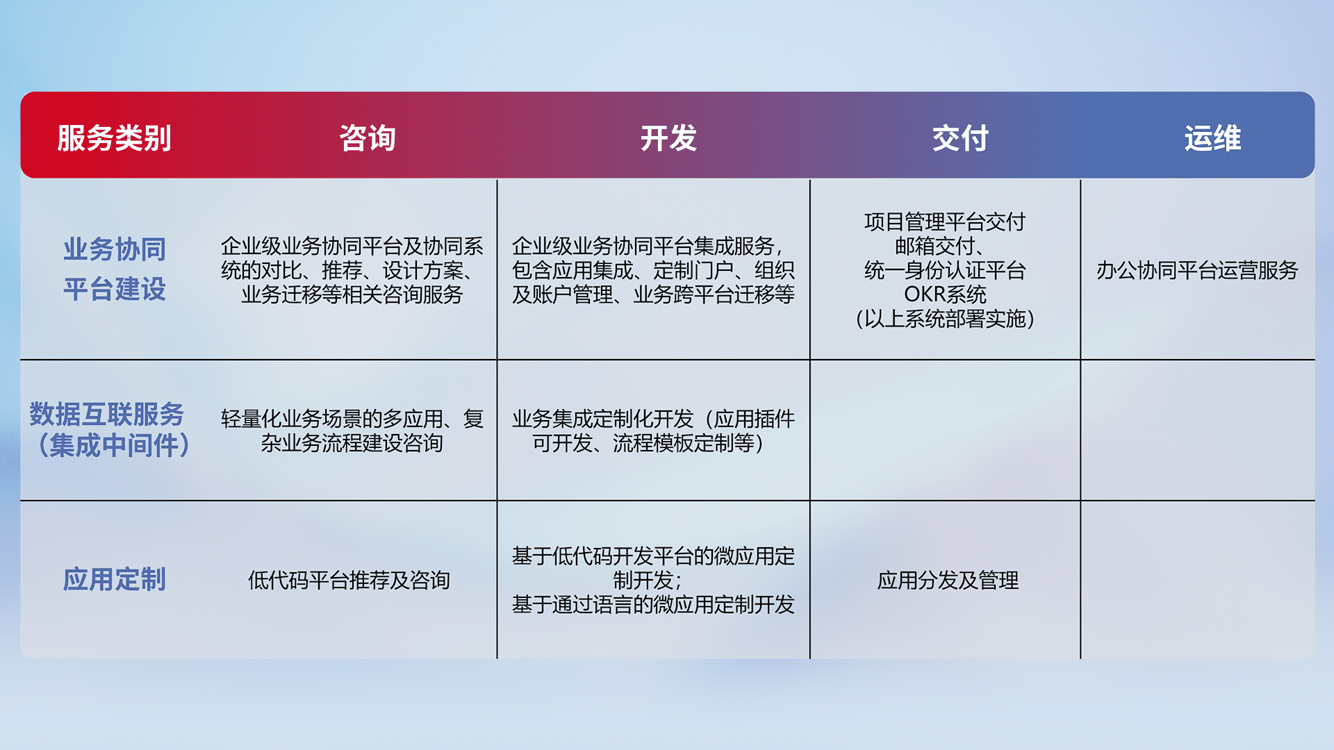 针对钉钉、、、企微、、、IDaas等平台级产品提供产品的规划、、、、方案、、交付、、、定制化开发等服务,,实现如统一协同办公、、、、智能客户服务、、混合会议管理、、、、智能数据查询、、、、等业务场景,,实现数字化转型。。。